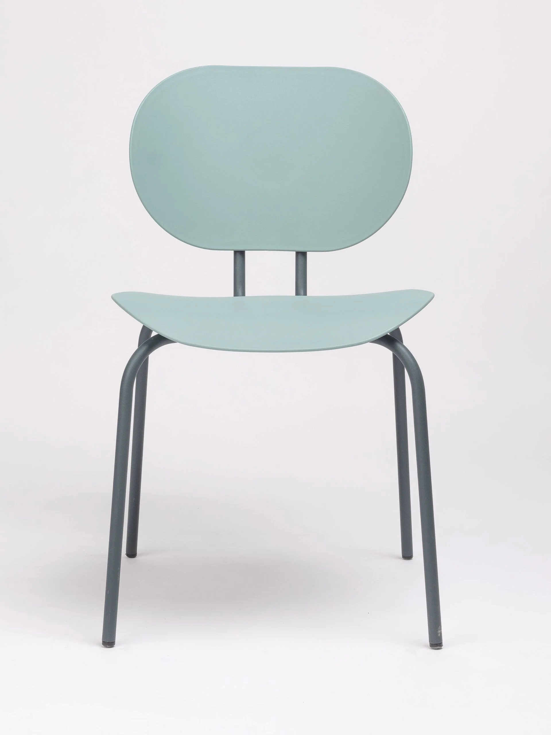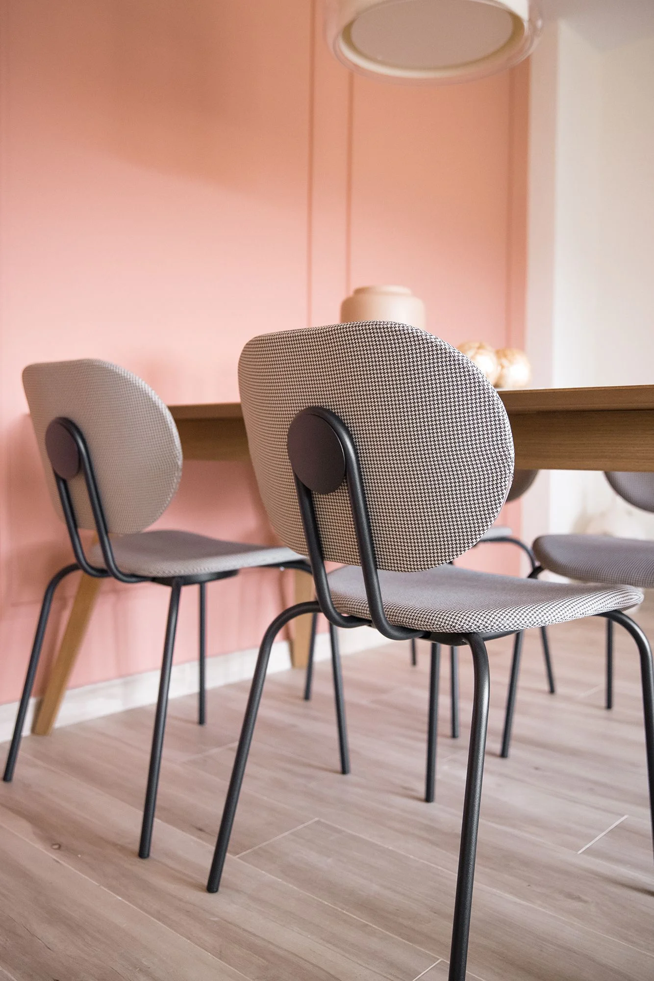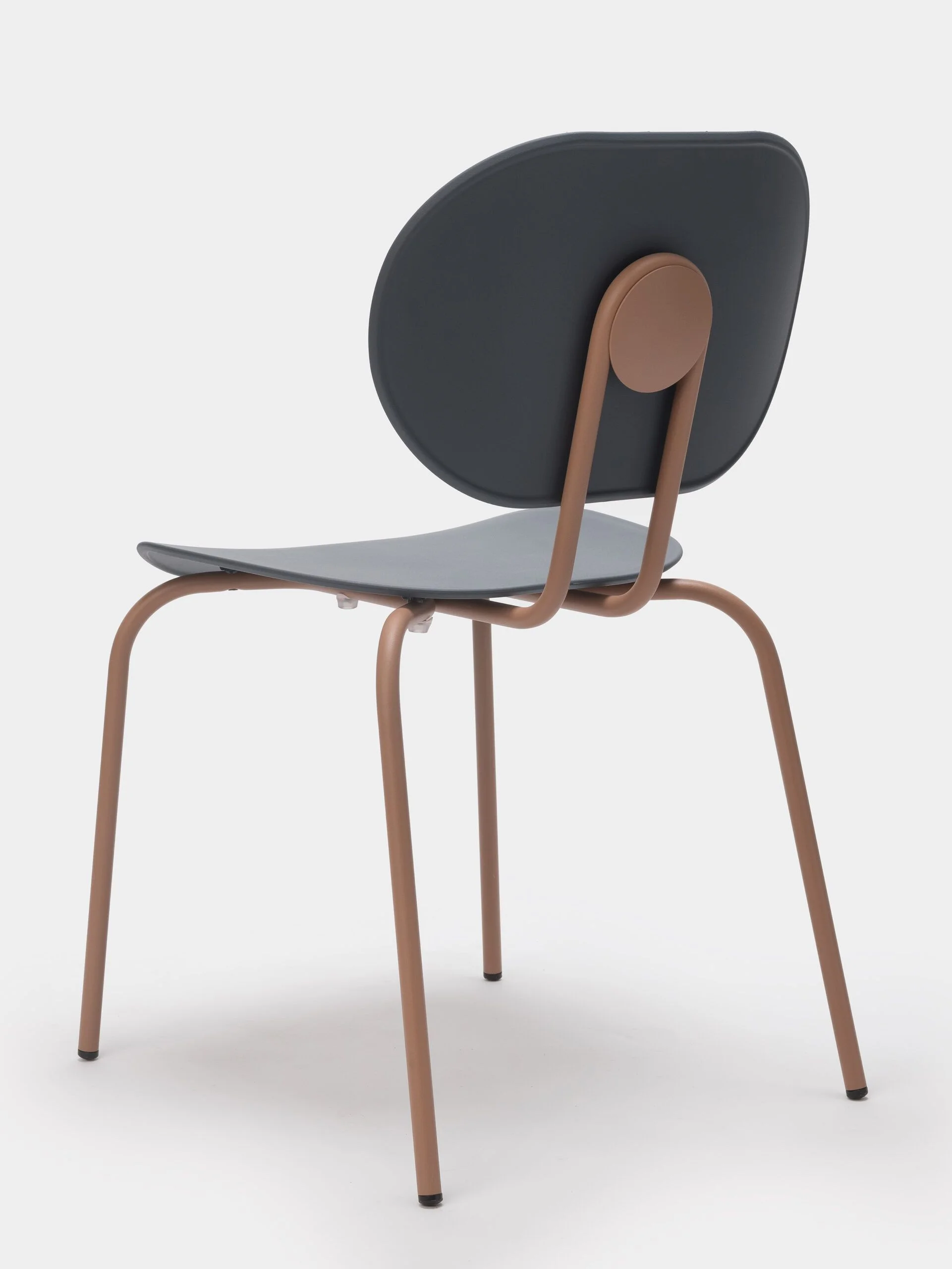 En cuanto a la base, ofrece múltiples configuraciones: estructura metálica con acabado lacado o cromado, patas de madera natural o base de cuatro radios, según el uso y la imagen deseada. Puede incluir brazos integrados para mayor ergonomía o presentarse en versión sin brazos para facilitar la movilidad y el apilado.