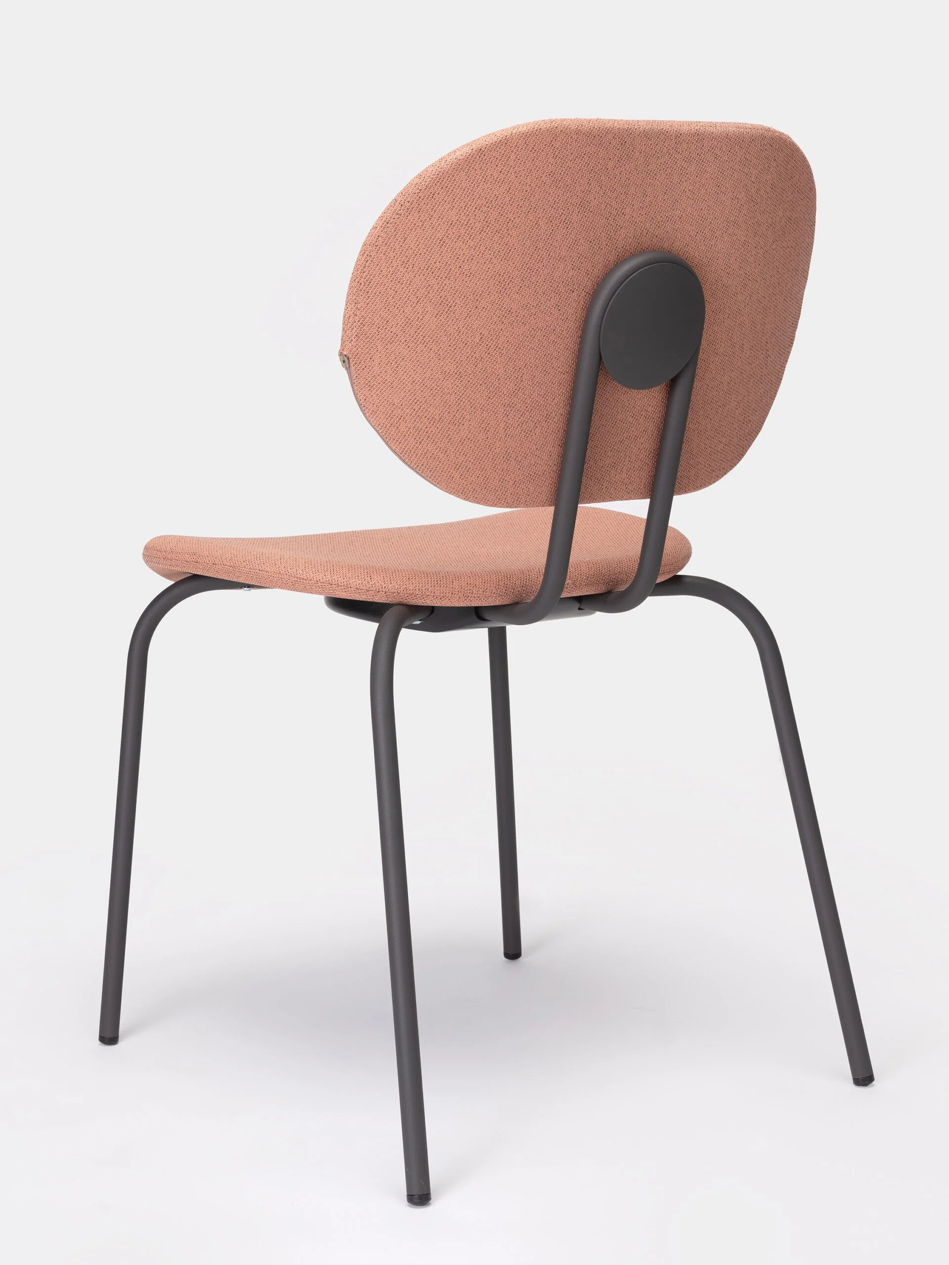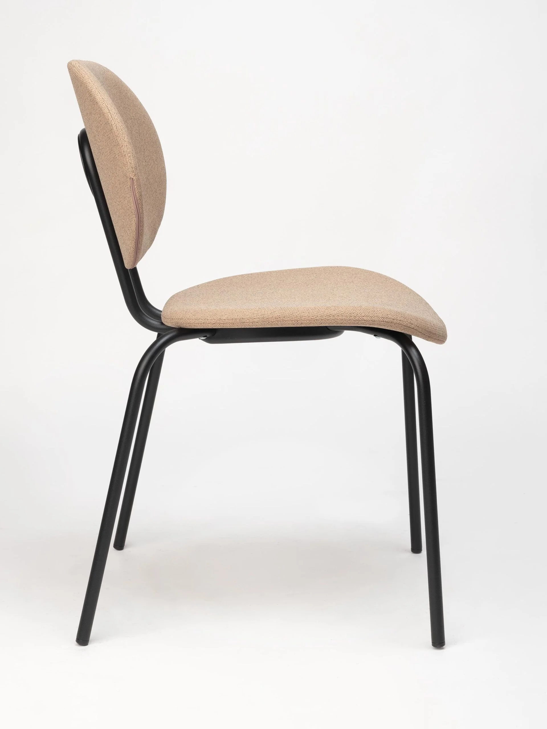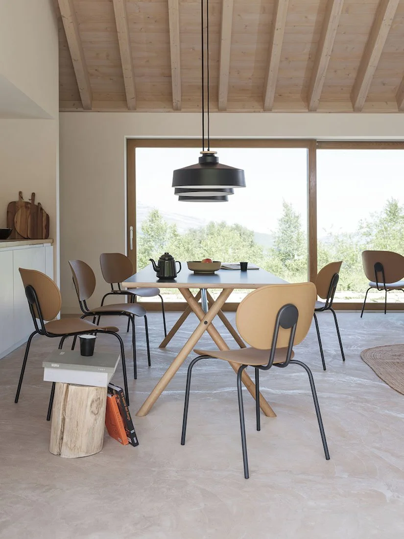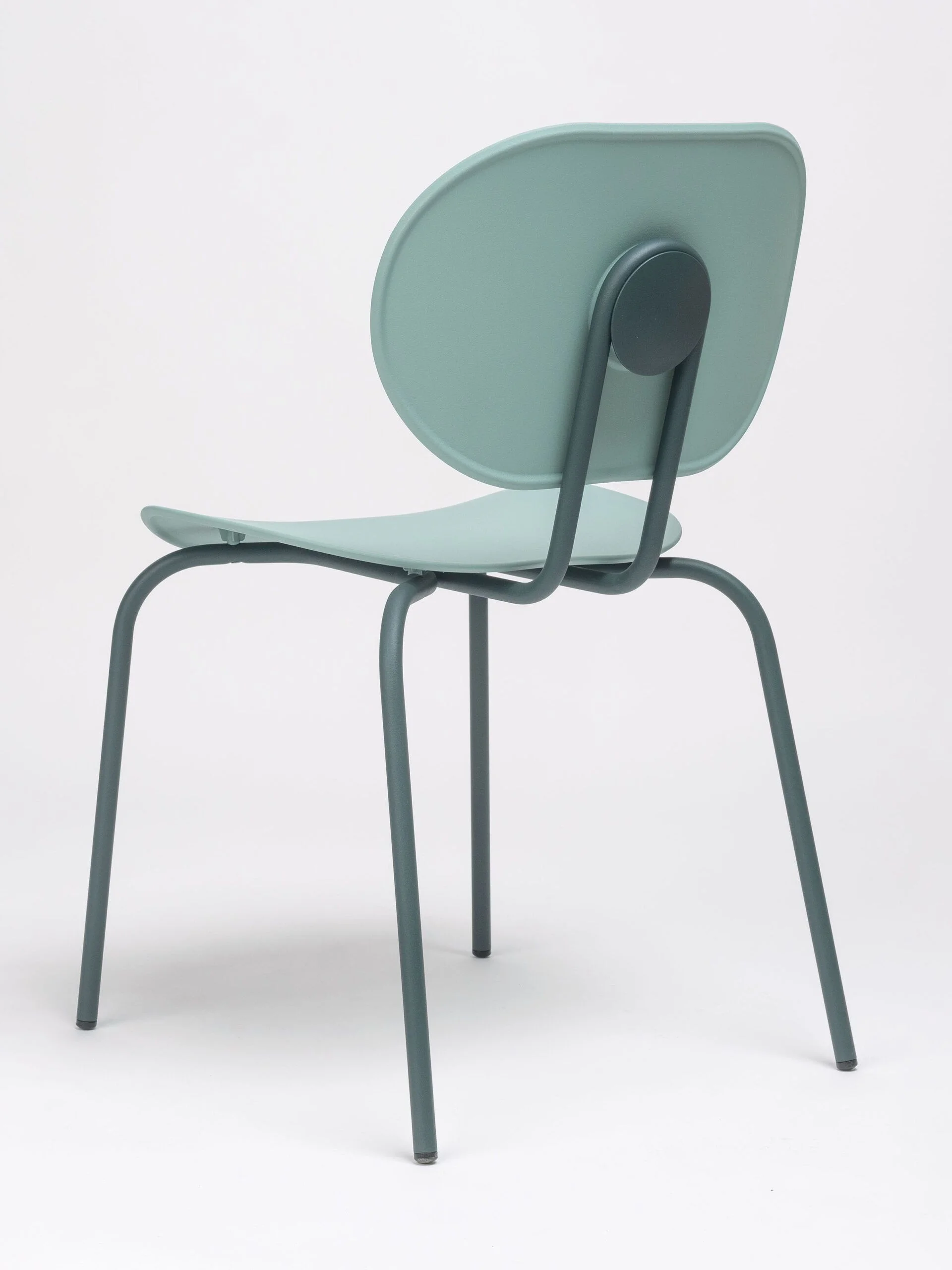 En cuanto a la base, ofrece múltiples configuraciones: estructura metálica con acabado lacado o cromado, patas de madera natural o base de cuatro radios, según el uso y la imagen deseada. Puede incluir brazos integrados para mayor ergonomía o presentarse en versión sin brazos para facilitar la movilidad y el apilado.