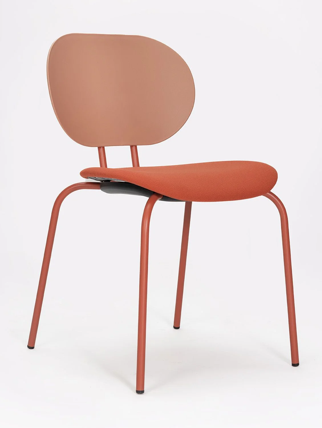 El asiento y respaldo están fabricados en polipropileno de alta calidad, disponible en una amplia gama de colores, lo que permite adaptarla fácilmente a distintos estilos de interiorismo. Existe la posibilidad de incorporar asiento tapizado o tapizado integral para mejorar el confort y aportar un carácter más cálido y profesional. Los tejidos pueden personalizarse en diferentes acabados y categorías, tanto para entornos corporativos como públicos.
